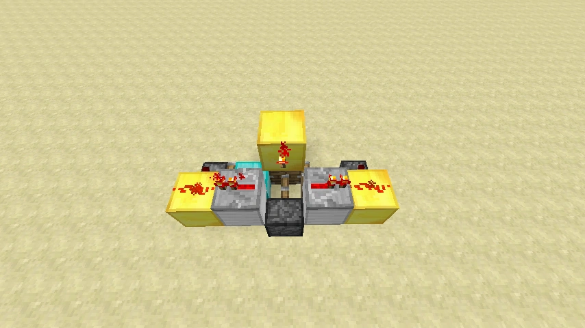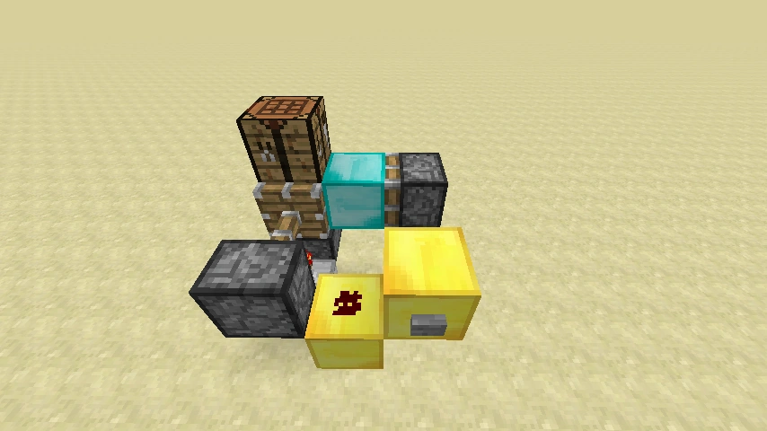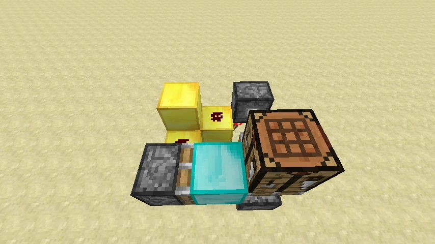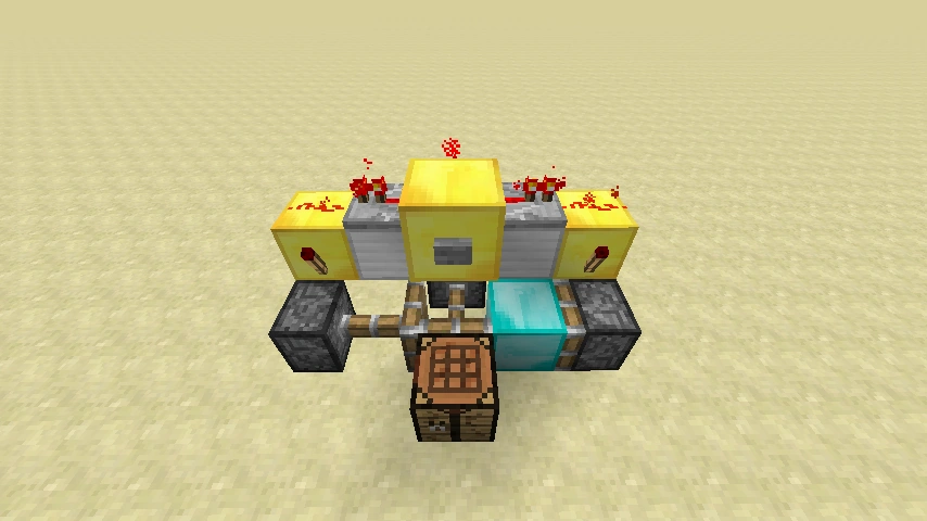 Betätigt man den Knopf, so werden beide Verstärker deaktiviert und die Redstone-Fackeln aktiviert. Der klebrige Kolben in der Mitte zieht nun die Werkbank zu sich. Nun fährt einer der beiden Kolben aus und verschiebt die Werkbank mit dem Diamantblock, wodurch nun dieser vor dem klebrigen Kolben steht. Jetzt wird der Diamantblock ausgefahren. Die Werkbank ist verstaut.