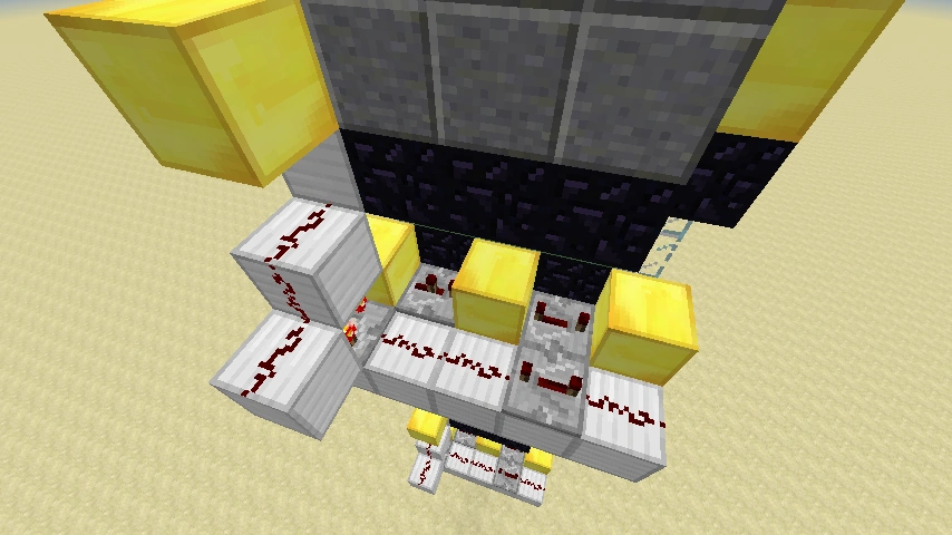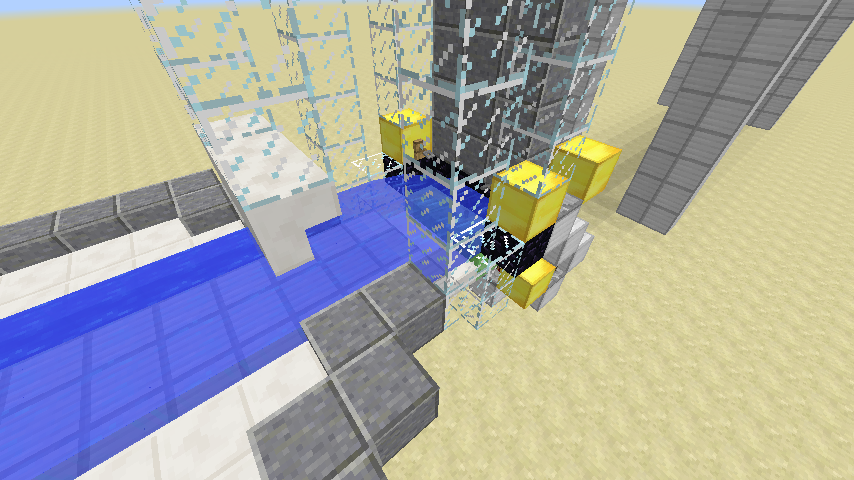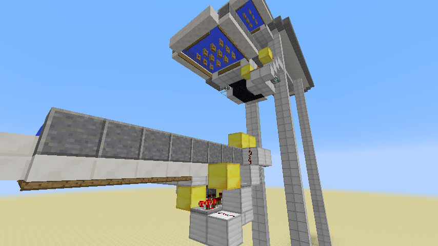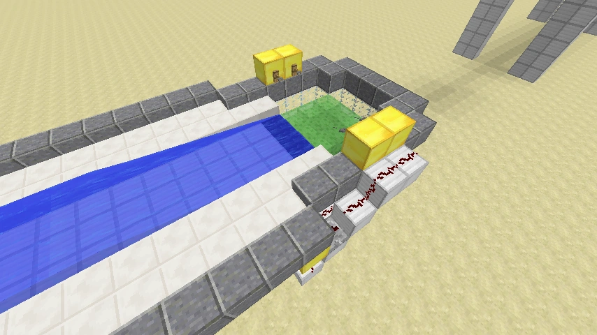 Diese zweite Variante des Bootsaufzuges ist kompakter als die erste und wurde raffinierter gestaltet. So fährt man mit dem Boot unten gegen Stolperdraht ein. Dieser erkennt dass sich jemand dort befindet und gibt mit einem Verstärker (Stufe vier) das Signal weiter. Dies gelangt dann an einen Taktgeber. Der ist dabei so gebaut, dass er zwei regelmäßige verschieden lange Takte abgibt. Der erste ist schnell und kurz, der zweite folgt später und ist etwas länger. Dieser Takte werden an einen klebrigen Kolben weiter geleitet. Dieser bewegt dann wiederum drei Schleimblöcke nach oben. Wenn sich das Boot nun dort über den Schleimblöcken befindet, wird es nach oben katapultiert. Falls es beim ersten mal nicht klappen sollte, sorgt der zweite längere Takt dafür dass es aber dann klappt. Oben angekommen befindet sich ebenfalls eine Vorrichtung, welche den Spieler wieder erkennt und dann erneut nach oben katapultiert. Diese Vorrichtung kann man beliebig oft übereinander bauen. Oben angekommen, kann der Spieler den Kanal entlang fahren. Wenn er stattdessen wieder herunter möchte, so fährt er einfach in den Aufzug hinein und kann problemlos durch die Zauntore hinab fallen. Unten angekommen kann er dann auch zu seinem Ziel fahren.