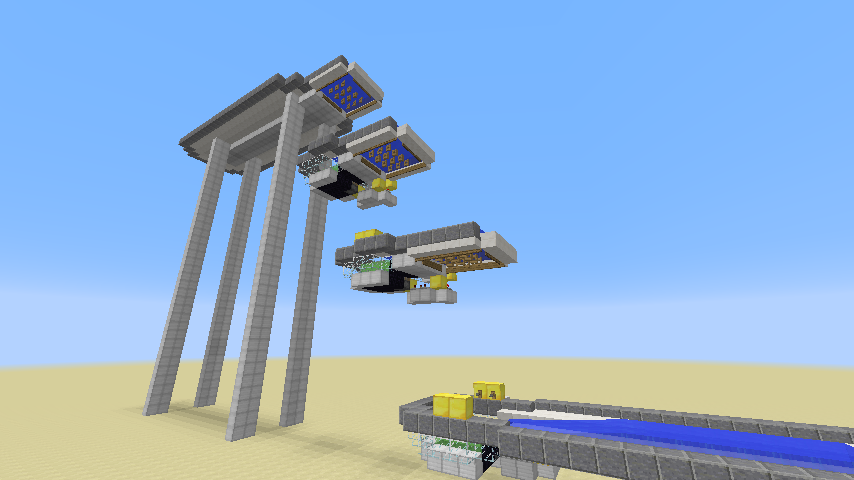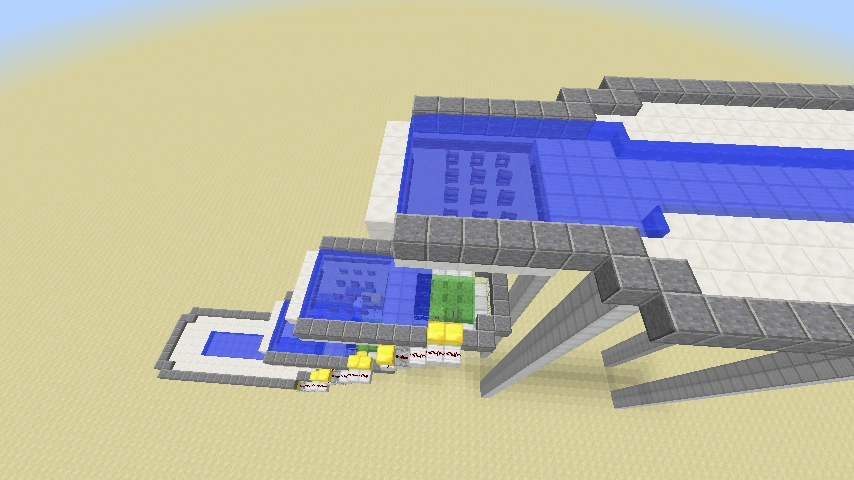 Mit Hilfe des Bootsaufzuges ist es möglich Boote fast senkrecht nach oben zu transportieren. Hierbei wird ein Schacht mit Schleimblöcken gesetzt, der mit verschiedenen Redstone-Elemente, das Boot welches unten hinein fährt, automatisch nach oben katapultiert. Hierbei kann das Boot maximal 12 Meter nach oben geschossen werden, noch höher geht nur, wenn man erneut einen Schleimblock-Schacht erbaut. Der Spieler selbst erhält keinerlei Schaden oder ähnliches wenn er diesen Aufzug durchfährt, auch nicht wenn er versehentlich an die Ränder katapultiert wird, da dort Stufen platziert sind. Fährt nun der Spieler samt Boot in den Schacht ein, so berührt er zuerst den Stolperdraht welcher mit Redstone-Kabel verbunden ist. Dabei erhält ein Verstärker auf stufe zwei das Redstone-Signal. Dieser leitet es anschließend in einen Komparator im Subtraktionsmodus. Dieser wiederum an zwei Verstärker auf der höchsten Stufe. Diese lösen dann den klebrigen Kolben aus, der die Schleimblöcke nach oben schiebt. Ein Redstone-Kabel leitet dieses Signal aber wieder zurück zu dem Komparoter, welcher somit als Taktgeber arbeitet. Zu dieser Zeit befindet sich das Boot auf den Schleimblöcken und wird nach oben katapultiert. Wenn man hinein fährt sollte man auch aufpassen, das man relativ mittig in den Schacht hinein fährt, da man sich sonst erst aus der misslichen Lage wieder heraus paddeln muss. Da jedoch der oben befindliche Wasserstrom sehr breit gebaut wurde können auch schlecht gewählte Einfahrtswinkel relativ schnell wieder korrigiert werden. Oben angekommen, kann man dann die Kanalbrücke weiter fahren. Wenn man nun von der Kanalbrücke aus kommt und man jetzt nach unten fahren möchte, so fährt man einfach über den Rand hinaus (gegen die Strömung), welcher extra kurz ist, dadurch fällt man hinunter und landet unten im Kanal und kann von dort aus diesen weiter entlang fahren.