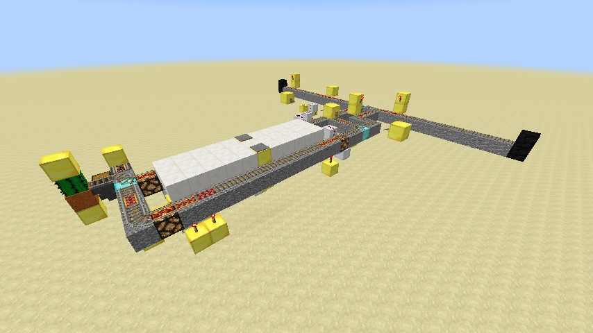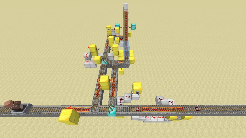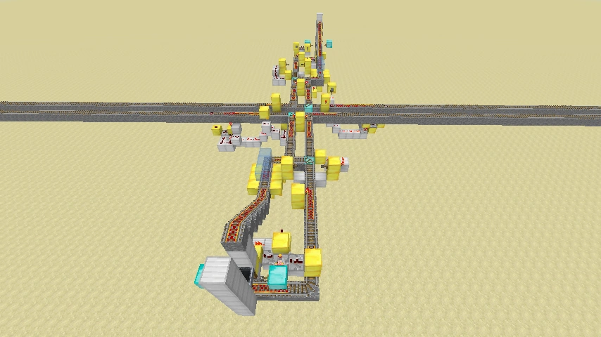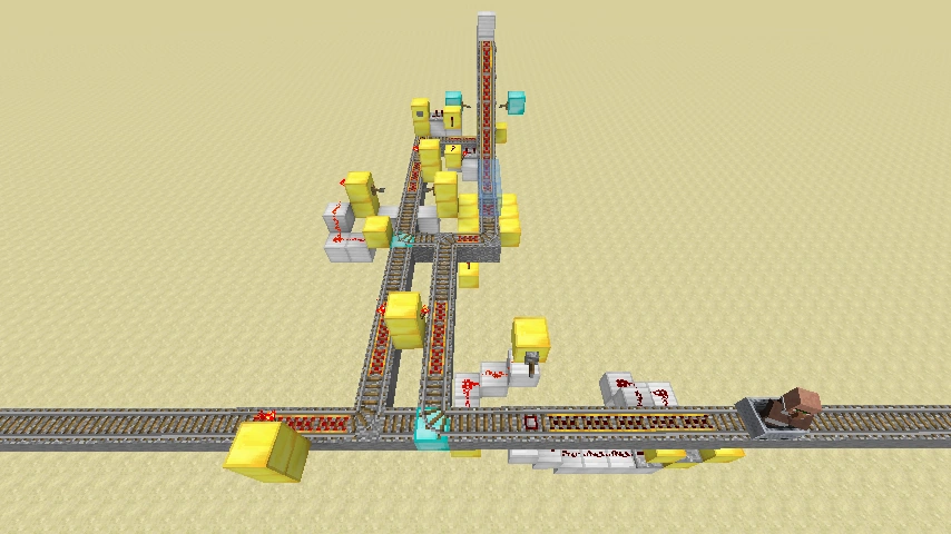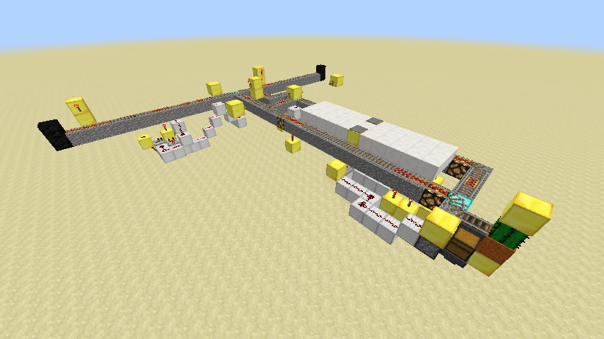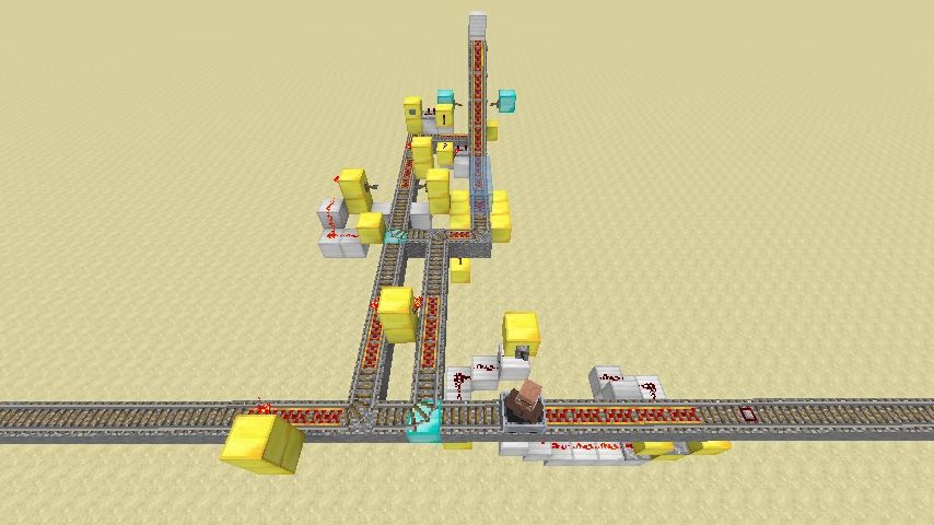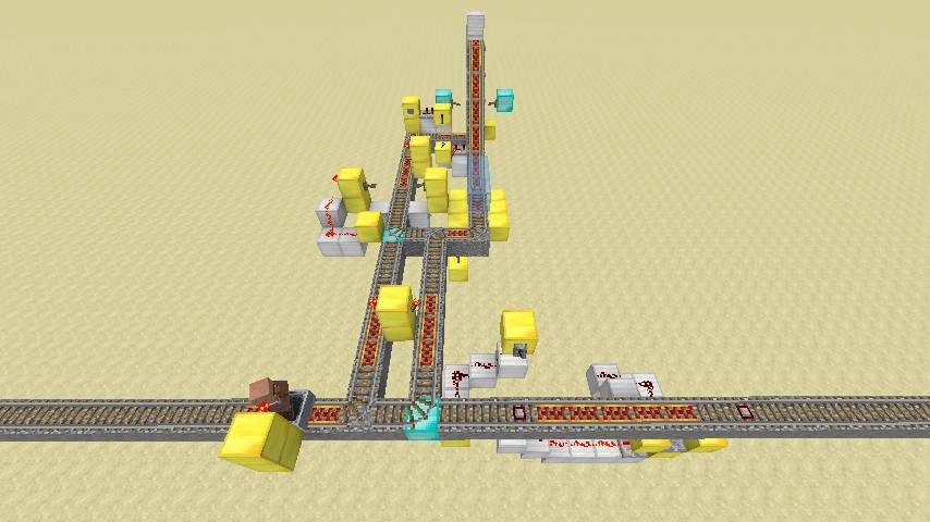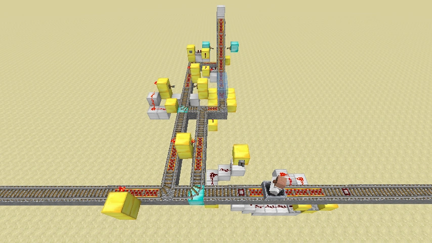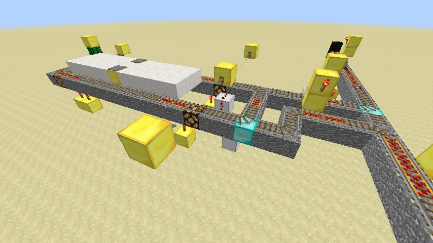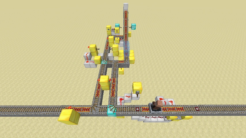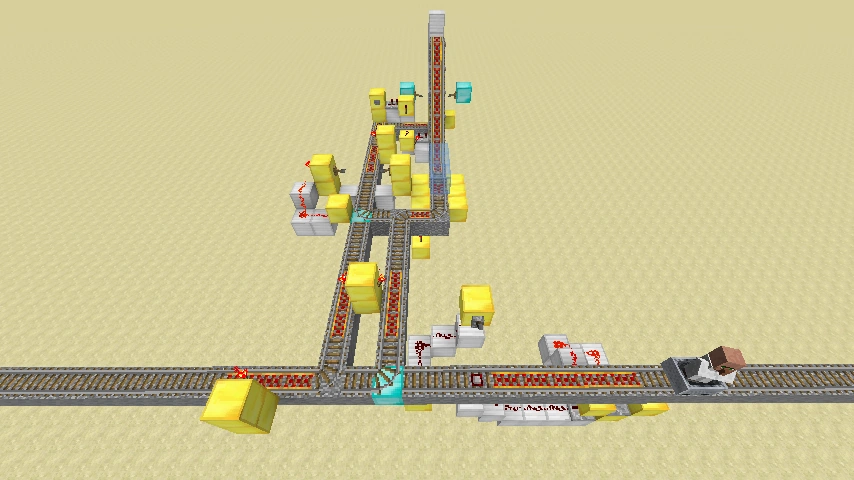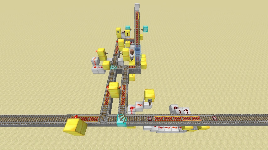 Dieser Durchfahrtsbahnhof ist sehr einfach gehalten und erfüllt die Grundvoraussetzungen und ist gerade für Einsteiger sehr praktisch. Das Prinzip dieses Durchfahrtsbahnhofes ist folgendes, sobald ein Spieler mit einer Lore zu dieser Haltestelle fährt, wird er von der ersten Antriebsschiene gebremst. Nun hat er die Wahl, entweder er fährt weiter oder er legt den Hebel um und gelangt so in diesen Durchfahrtsbahnhof. Wenn nun ein Passagier mit Lore in die Gleisstrecke des Durchfahrtsbahnhofs einfährt, so wird zuerst die Sensorschiene ausgelöst. Diese aktiviert eine Speicherzelle, welche die Antriebsschienen ständig ein- und ausschaltet. Nun gelangt die Lore auf die permanent pulsierenden Antriebsschienen, dadurch wird diese verlangsamt und der Spieler hat nun mehr Zeit den Hebel umzulegen, falls er in diesen Durchfahrtsbahnhof einfahren möchte. Nun legt man den Hebel um und die Weiche wird umgestellt. Am Ende der pulsierenden Antriebsschienen befindet sich ebenfalls eine Sensorschiene, diese deaktiviert nach dem darüberfahren, die Speicherzelle, wodurch die Antriebsschienen aufhören periodisch ein- und auszugehen. Nun lenkt die Lore in den Durchfahrtsbahnhof ein und man fährt dort rein. Am Ende des Bahnsteigs wird man dann von einer Aktivierungsschiene ausgeworfen und die Lore fährt in den Lorenspeicher ein. Möchte man von diesen Durchfahrtsbahnhof weiter reisen, so tritt man auf eine der Druckplatten auf dem Bahnsteig und wartet bis die Lore kommt. in diese steigt man dann ein und fährt dann die Gleisstrecke entlang bis zum Zielbahnhof.