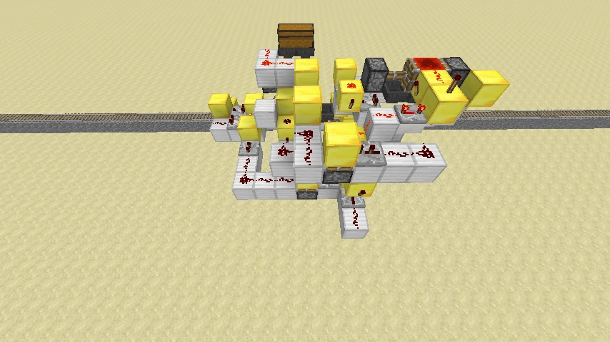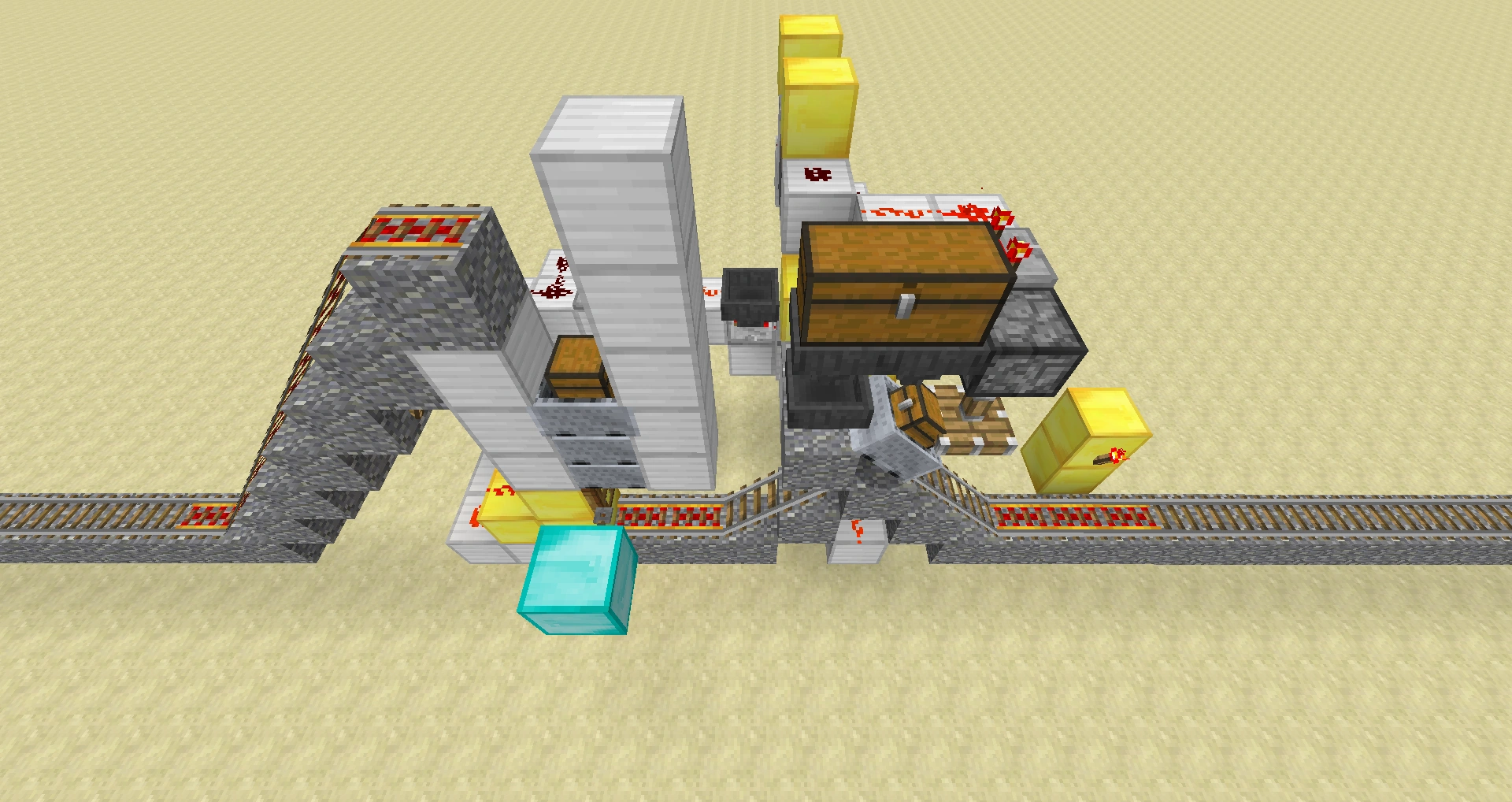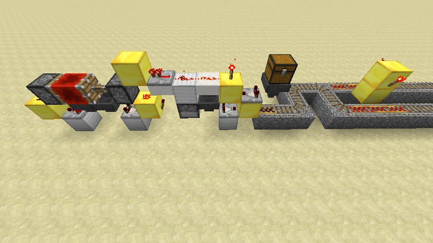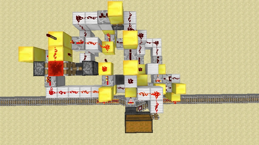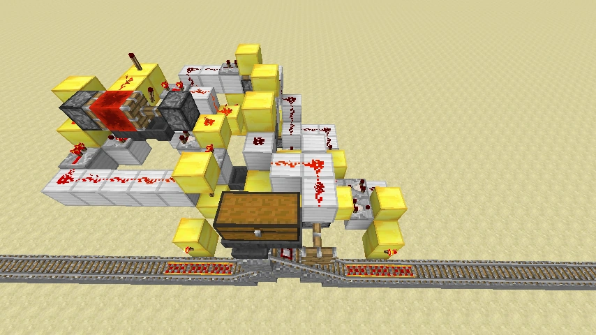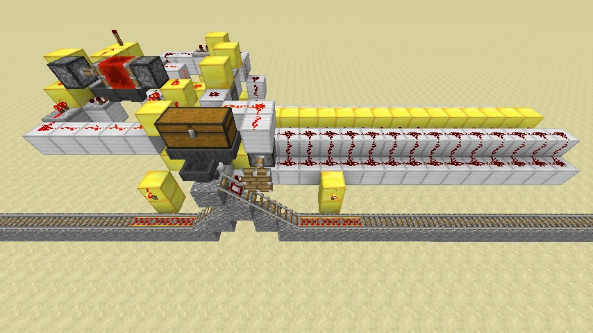 Damit ein einfacher Güter-Belader ein wenig automatisch arbeitet, kann man den Belader der Variante 5 mit einem Taktgeber kombinieren. Der sorgt dafür, dass die Güterlore nach einer bestimmten Zeit auf jeden Fall losgeschickt wird. Zwar ist dies nicht die eleganteste Art, jedoch eignet sich dieser Belader hervorragend für Bereiche, bei denen man nicht viel Platz zur Verfügung hat. Solange der Belader leer ist, wird der Taktgeber ausgeschaltet, damit man nicht dauernd Kolben im Hintergrund schieben hört. Wenn man nun die Truhe befüllt, wird wie schon in der Variante 4 erwähnt, die Antriebsschiene deaktiviert, damit Güterloren anhalten und beladen werden können. Jedoch wird jetzt auch der Taktgeber aktiviert. Je mehr Gegenstände in den Trichtern des Taktgebers sind, desto länger wartet der Belader, bis er eine Güterlore wegschickt. Das heißt je länger er wartet, umso effizienter wird die Güterlore befüllt. Mit dieser Variante kann man jedoch nie sehr effiziente Güterloren losschicken, denn sie werden nie wirklich voll beladen. Dafür ist aber der Bau-Aufwand für so einen Belader im Gegensatz zu den Varianten 1 bis 3 recht gering.