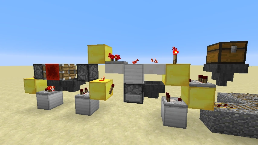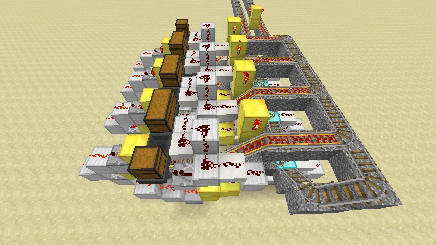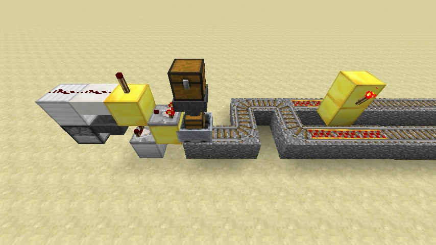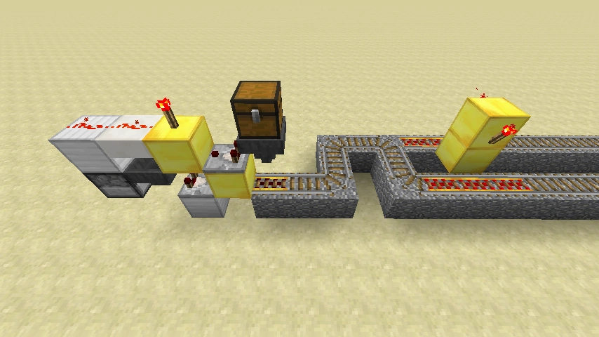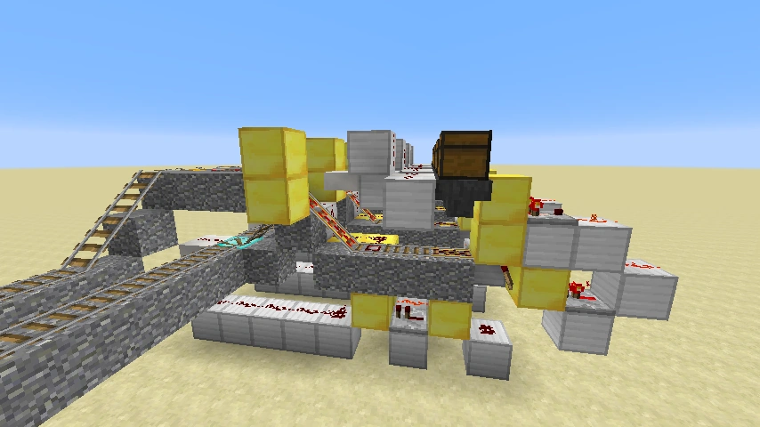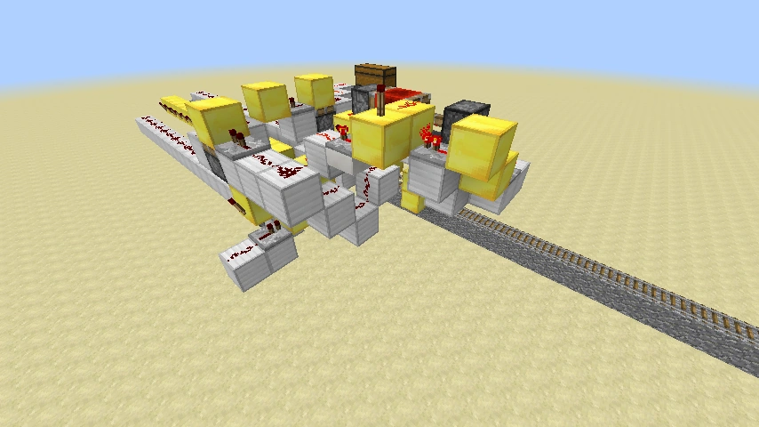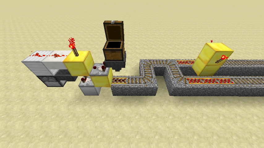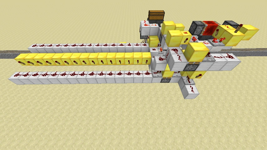 Damit ein einfacher Güter-Belader ein wenig automatisch arbeitet, kann man den Belader der Variante 5 mit einem Taktgeber kombinieren. Der sorgt dafür, dass die Güterlore nach einer bestimmten Zeit auf jeden Fall losgeschickt wird. Zwar ist dies nicht die eleganteste Art, jedoch eignet sich dieser Belader hervorragend für Bereiche, bei denen man nicht viel Platz zur Verfügung hat. Solange der Belader leer ist, wird der Taktgeber ausgeschaltet, damit man nicht dauernd Kolben im Hintergrund schieben hört. Wenn man nun die Truhe befüllt, wird wie schon in der Variante 4 erwähnt, die Antriebsschiene deaktiviert, damit Güterloren anhalten und beladen werden können. Jedoch wird jetzt auch der Taktgeber aktiviert. Je mehr Gegenstände in den Trichtern des Taktgebers sind, desto länger wartet der Belader, bis er eine Güterlore wegschickt. Das heißt je länger er wartet, umso effizienter wird die Güterlore befüllt. Mit dieser Variante kann man jedoch nie sehr effiziente Güterloren losschicken, denn sie werden nie wirklich voll beladen. Dafür ist aber der Bau-Aufwand für so einen Belader im Gegensatz zu den Varianten 1 bis 3 recht gering.