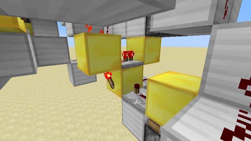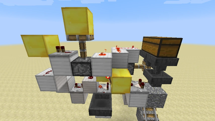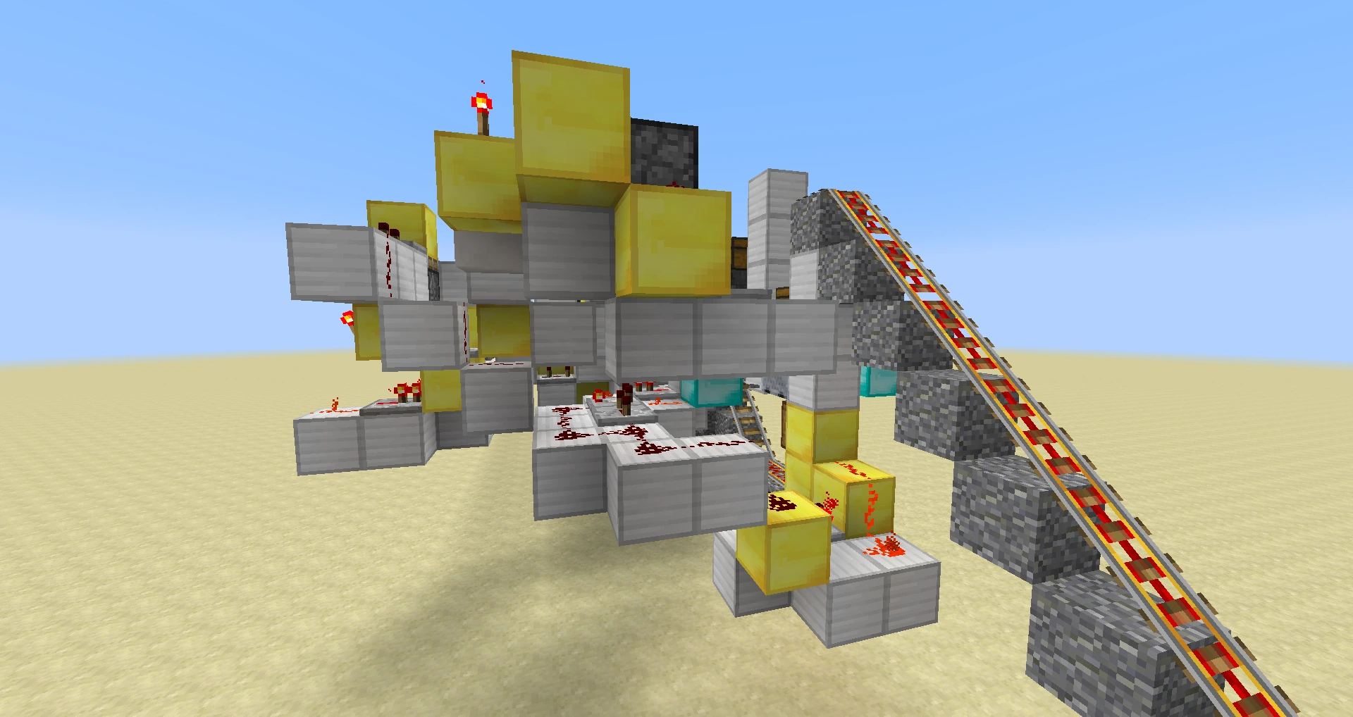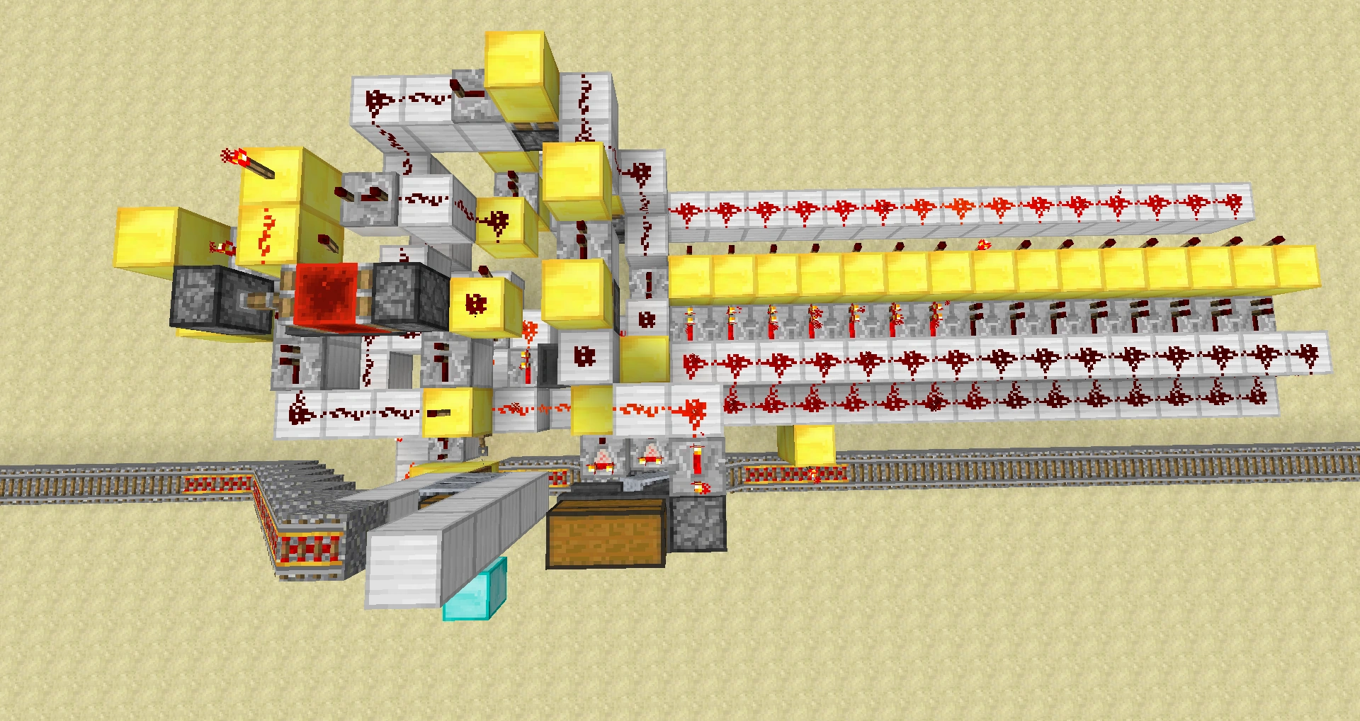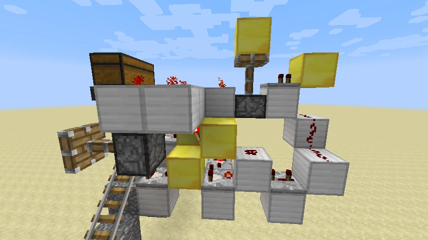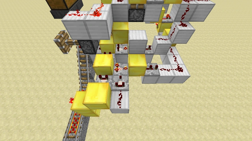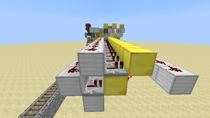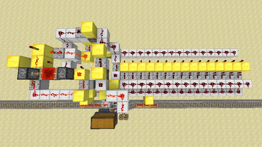 Nur um das dritte Merkmal abzudecken, muss der Güter-Belader aus der ersten Variante um die im Bild zu sehende Schaltung erweitert werden. Der Komparator an der Sensorschiene gibt ein Signal an den Goldblock vor sich ab. Von dort wird das Signal auf dem Redstone-Kabel bis zur maximalen Länge von 15 Blöcken abgegriffen. So stellt diese Schaltung fest, wie weit die Güterlore befüllt ist. Das heißt, wenn die Güterlore zum Beispiel von 2/15 auf 3/15 weiter aufgefüllt wird, wird kurz das Signal am Ausgang der Schaltung ausgehen und danach wieder angehen. Dieses Schwanken des Signals wird direkt an einen Impulsgeber weitergeleitet. Solange sich dieses Signal in einer bestimmten Zeit kurz ändert, wird die Güterlore immer weiter befüllt. Wenn also in einer bestimmten Zeit (62 Redstone-Ticks) kein weiterer Signal-Impuls kommt, müssen logischerweise alle Slots der Güterlore belegt sein, ohne dass sie zwingend mit 64 Einheiten belegt sind. Nun muss man einen Trichter-Taktgeber (64 Gegenstände im Trichter-Taktgeber) an einen Zähler anschließen. Dieser Taktgeber gibt alle 64 Redstone-Ticks ein Signal an den Zähler weiter. Der Zähler kann bis 2 zählen. Wenn nun der Taktgeber ein Signal an den Zähler weitergibt, wird der Zähler für weitere 64 Redstone-Ticks auf der Binärzahl 1 stehen bleiben, bis ihn der Taktgeber ein weiteres Mal um eine Stelle erhöht. Damit man feststellen kann, ob die Güterlore nicht voll ist, wird der Impuls von der in Variante 1 beschriebenen Schaltung genommen, der den Zähler immer wieder auf 0 setzt. Solange die Güterlore befüllt wird, gibt sie konstant nach 62 Redstone-Ticks ein Signal auf den Zähler weiter, welches diesen wieder auf 0 stellt. Der Taktgeber wiederum gibt alle 64 Redstone-Ticks ein Signal an den Zähler weiter, welcher sich dann um eine Stelle erhöht. Somit kann der Zähler niemals die Zahl 2 erreichen, solange die Güterlore befüllt wird. Wenn also doch die Zahl 2 erreicht wird, bedeutet das, dass die Lore voll ist, obwohl ihre Slots nicht mit dem Maximum an Einheiten befüllt sind. Der Zähler gibt ein Signal an den ausgefahrenen Kolben, wenn der Zähler die Zahl 2 erreicht. Wenn das geschieht, wird die Güterlore losgeschickt.