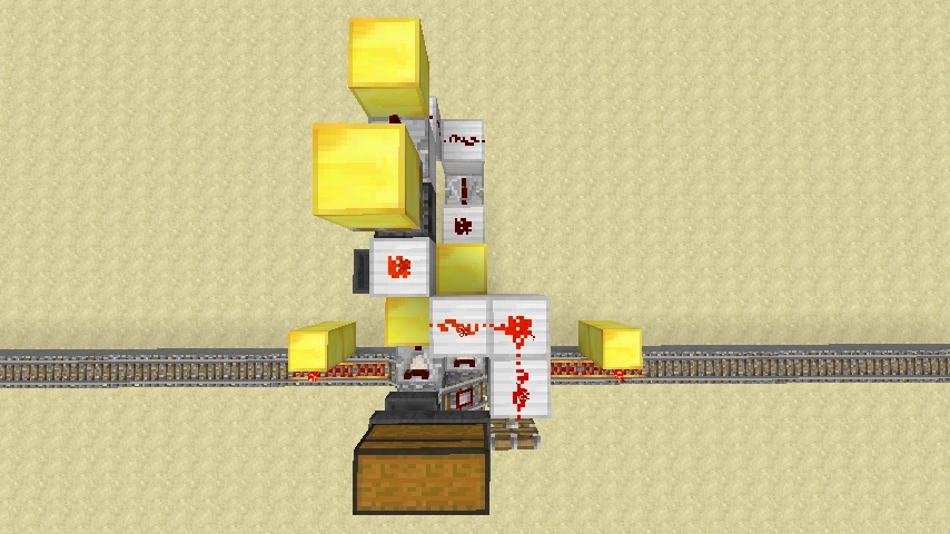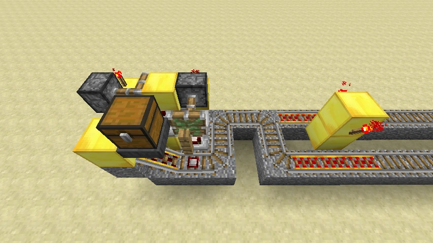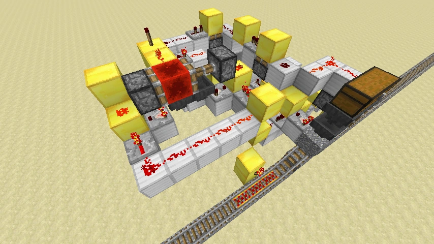 Dieser Güter-Belader wurde auf ein gewisses Minimum reduziert. Dieser Belader erkennt nur, ob der Belader selbst leer ist. Auf die beiden anderen Merkmale kann er nicht reagieren und würde die Güterlore in diesen Fällen festhalten. Wenn dann der Belader überfüllt ist, bleibt die Güterlore hängen. Das gleiche gilt bei unterschiedlichen Gegenständen, welche dann auch nicht alle in die Güterlore beladen werden können, wodurch der Güter-Belader die Güterlore festhalten würde. Die Anlage funktioniert so: Falls eine Güterlore zu diesem Belader fährt, wird die Lore nur dann einfach weitergeschickt, wenn der Güter-Belader leer ist. Wenn der Güter-Belader Gegenstände beinhaltet, wird der Komparator die Redstone-Fackel ausschalten und diese wird dann kein Signal mehr an den Verstärker weitergeben, welcher die Antriebsschiene aktiviert, solange der Belader leer ist. Wenn der Belader etwas zu befüllen hat, wird die Antriebsschiene ausgeschaltet, wodurch eine heranfahrende Güterlore festgehalten wird, bis alles, was im Belader ist, in die Güterlore gefüllt wurde. Solche Belader eignen sich gut, wenn man selbst viel manuell ändern möchte, das heißt wenn man keine vollautomatischen Belader braucht.