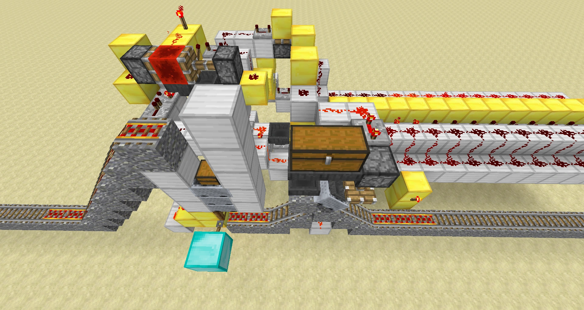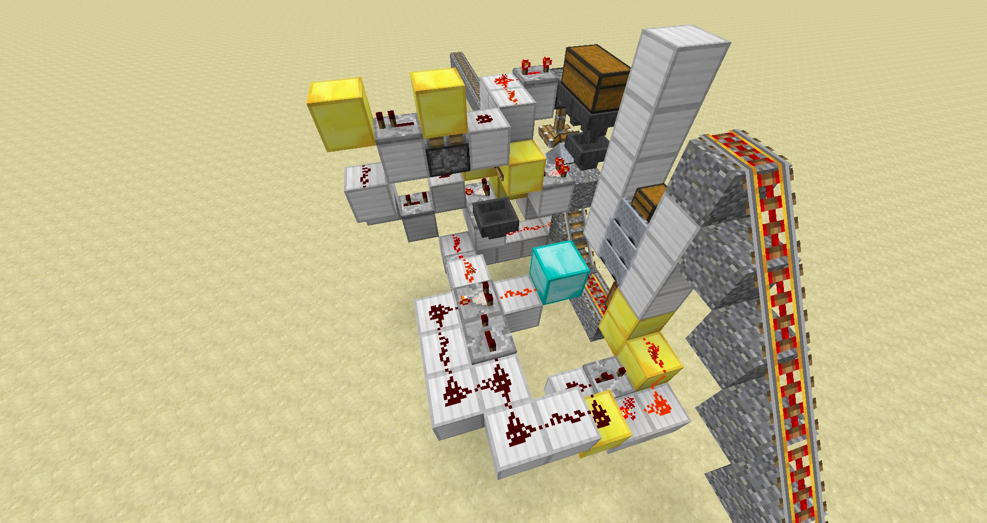 Dieser Güter-Belader stellt nur die ersten beiden Merkmale sicher. Wenn man also nicht zu unterschiedliche Materialien hineinlegt, wird dieser Güter-Belader ohne Probleme arbeiten können. Bei diesem Güter-Belader fährt die Güterlore von links in die Anlage hinein. Sie fährt durch die steigenden Schienen durch den Block hindurch auf die Sensorschiene (dies ist zwingend erforderlich, da durch diese Lage die Güterlore von zwei Trichtern gleichzeitig befüllt werden kann). Der ausgefahrene Kolben blockiert die Güterlore und hält sie an der Position. Je nachdem, ob Gegenstände in der Doppeltruhe liegen, fängt der Belader sofort an und schiebt alle Gegenstände in die Güterlore hinein. Wenn dies geschieht, wird der Trichter, der mit dem Komparator verbunden ist, ein invertiertes Signal an den Impulsgeber weitergeben. Dieser löst erst aus, sobald der Trichter keine Gegenstände in sich beherbergt (Merkmal 2). Wenn er beim Befüllen der Güterlore leer werden sollte, was bedeuten würde, dass der Güter-Belader leer ist, so würde der Impulsgeber ein Signal an den ausgefahrenen Kolben geben, welcher die Güterlore losschicken würde. Damit wäre der Vorgang beendet. Wenn jedoch der Güter-Belader voll genug ist, wird dieser Fall nicht eintreten und es kommt zum Merkmal 1. Die Güterlore wird so lange befüllt, bis sie komplett befüllt ist und keine Gegenstände mehr aufnehmen kann. Tritt dies ein, wird die Sensorschiene, die mit einem Komparator verbunden ist, eine Signalstärke von 15 liefern, welche als einzige Signalstärke durchgelassen wird, da der Komparator im Subtraktionsmodus ist und ein weiterer Komparator (als Füllstandsmesser mit einen Trichter verbunden, der 4×64 und 1×42 Gegenstände im Inventar beinhaltet) mit der Signalstärke 14 das Ergebnis um die genannte Signalstärke abzieht. Wenn nun die Signalstärke 15 auftritt, kommt die Signalstärke 1 nach der Subtraktion heraus. Dieses Signal reicht aus, um den ausgefahrenen Kolben einfahren zu lassen, damit die Güterlore losfahren kann. Wie schon weiter oben beschrieben, kann dieser Belader nicht erkennen, ob die Slots der Lore alle mit verschiedenen Gegenständen in geringer Menge (zum Beispiel 5 Smaragde) belegt sind. Wenn das der Fall ist, würde die Güterlore für immer im Belader stecken bleiben. Damit diese Situation nicht eintritt, muss man prüfen, wo dieser Belader aufgestellt wird. Wenn von vornherein klar ist, dass nur eine begrenzte Anzahl von unterschiedlichen Materialien verwendet wird (zum Beispiel: Bruchsteingenerator), so kann man diesen Belader ohne Probleme verwenden. Wenn jedoch zum Beispiel der Belader in einer Mine steht, wo man die verschiedensten Gegenstände in eine Truhe legt, sollte man besser einen Güter-Belader mit der erweiterten Funktion wie in Variante 2 nutzen, da dieser für diese Situation ausgelegt ist.