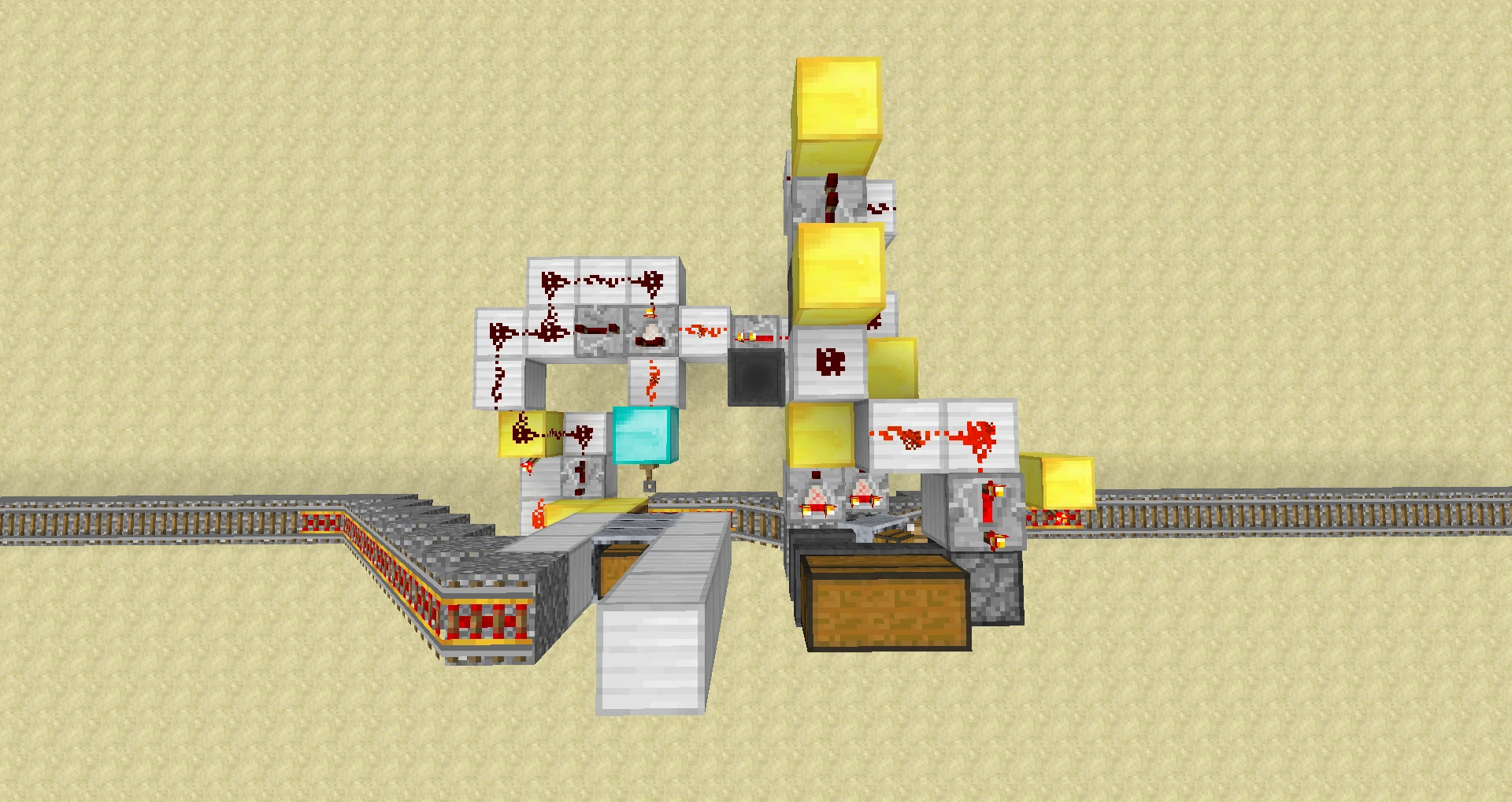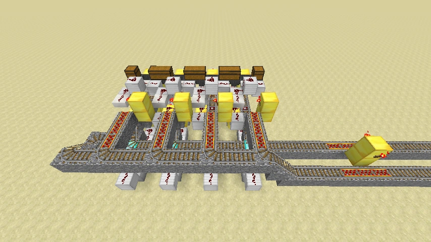 Dieser Güter-Belader ist perfekt für die Massenabfertigung geeignet. So kann er in diesem Beispiel vier Behälterloren gleichzeitig befüllen und losschicken. Wenn nun eine Behälterlore in diesen Belader hinein fährt, so wird sie erstmal durch ein erweitertes Abzweiggleis in das erste Fach geleitet. Nachkommende Behälterloren werden in die nächsten Fächer einsortiert. In einem Fach angekommen, werden die Trichter, die die Gegenstände aus den Truhen über sich ziehen, gesperrt. Nur der Trichter, der die Behälterlore füllt, bleibt aktiv. So wird der Trichter immer leerer. Wenn er einen bestimmten Mindestbestand erreicht hat, wird das von Komparator, der an den Trichter angeschlossen ist, erfasst. Das Signal wird dann an eine Speicherzelle geleitet, die die Behälterlore wieder losschickt. Dann wird auch das erweiterte Abzweiggleis zurückgesetzt und neue Behälterloren, vorzugsweise Trichterloren, können in das Fach einfahren. Da die Loren nur mit einer bestimmten Menge von Gegenständen befüllt werden, kann es niemals dazu kommen, dass eine Behälterlore nicht losgeschickt werden würde, weil sie nicht volle unterschiedliche Gegenstandsstapel enthält.