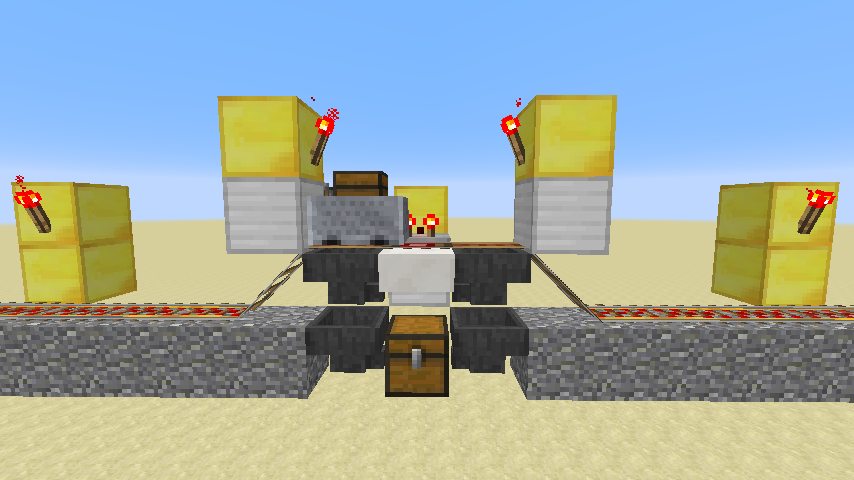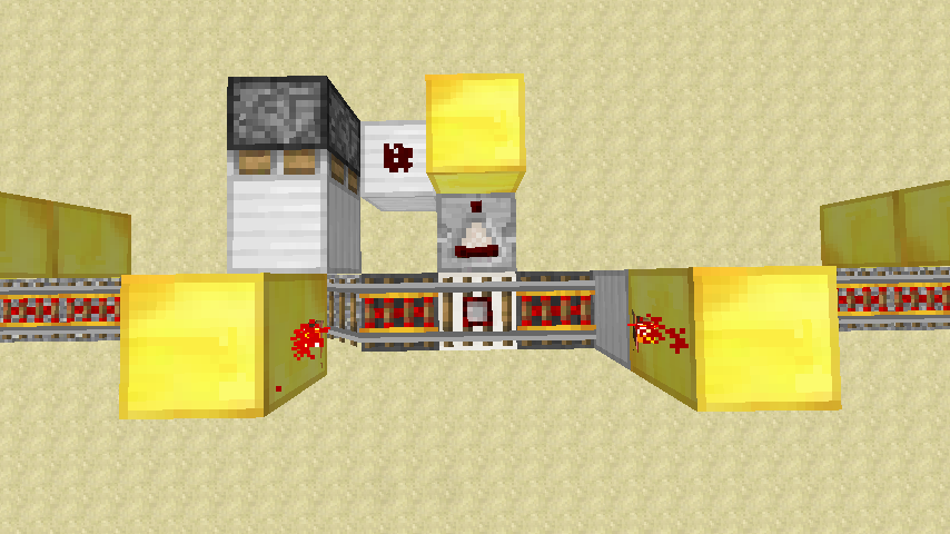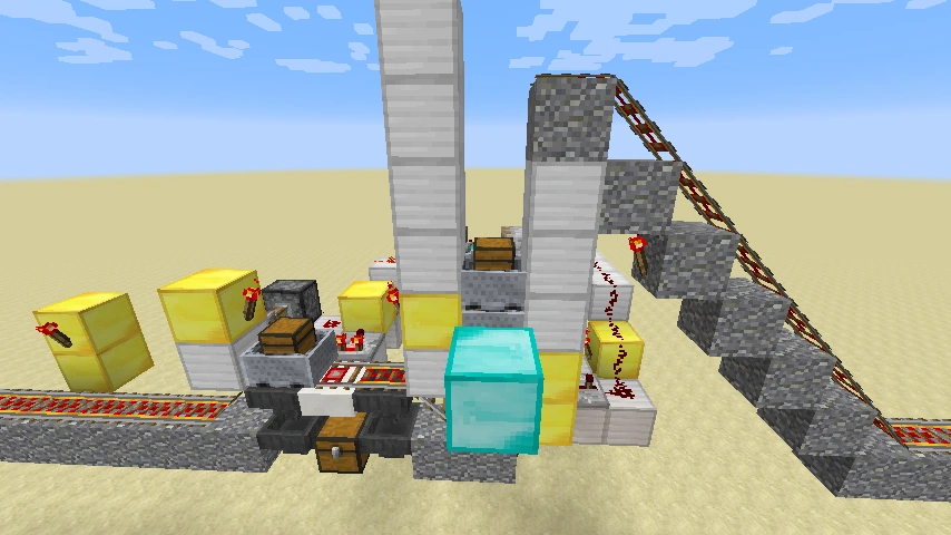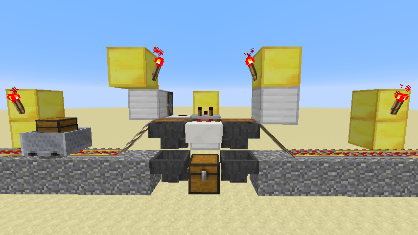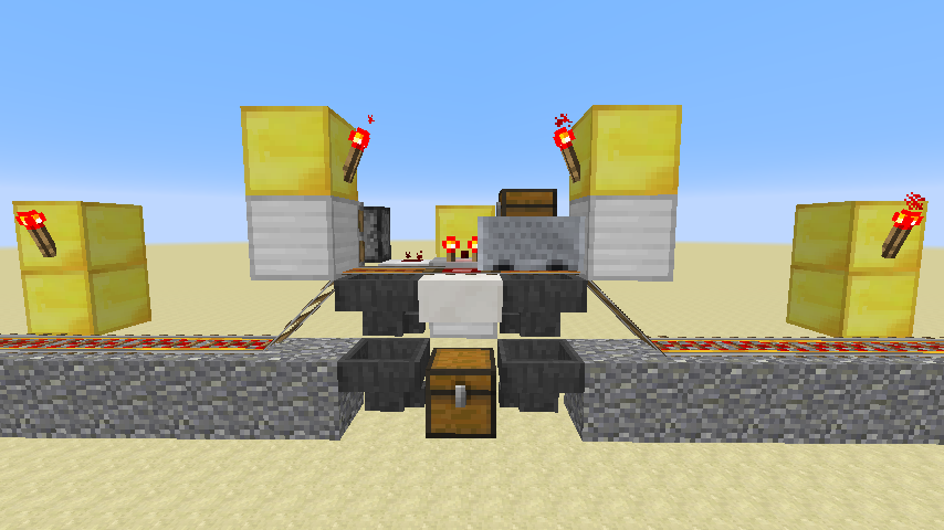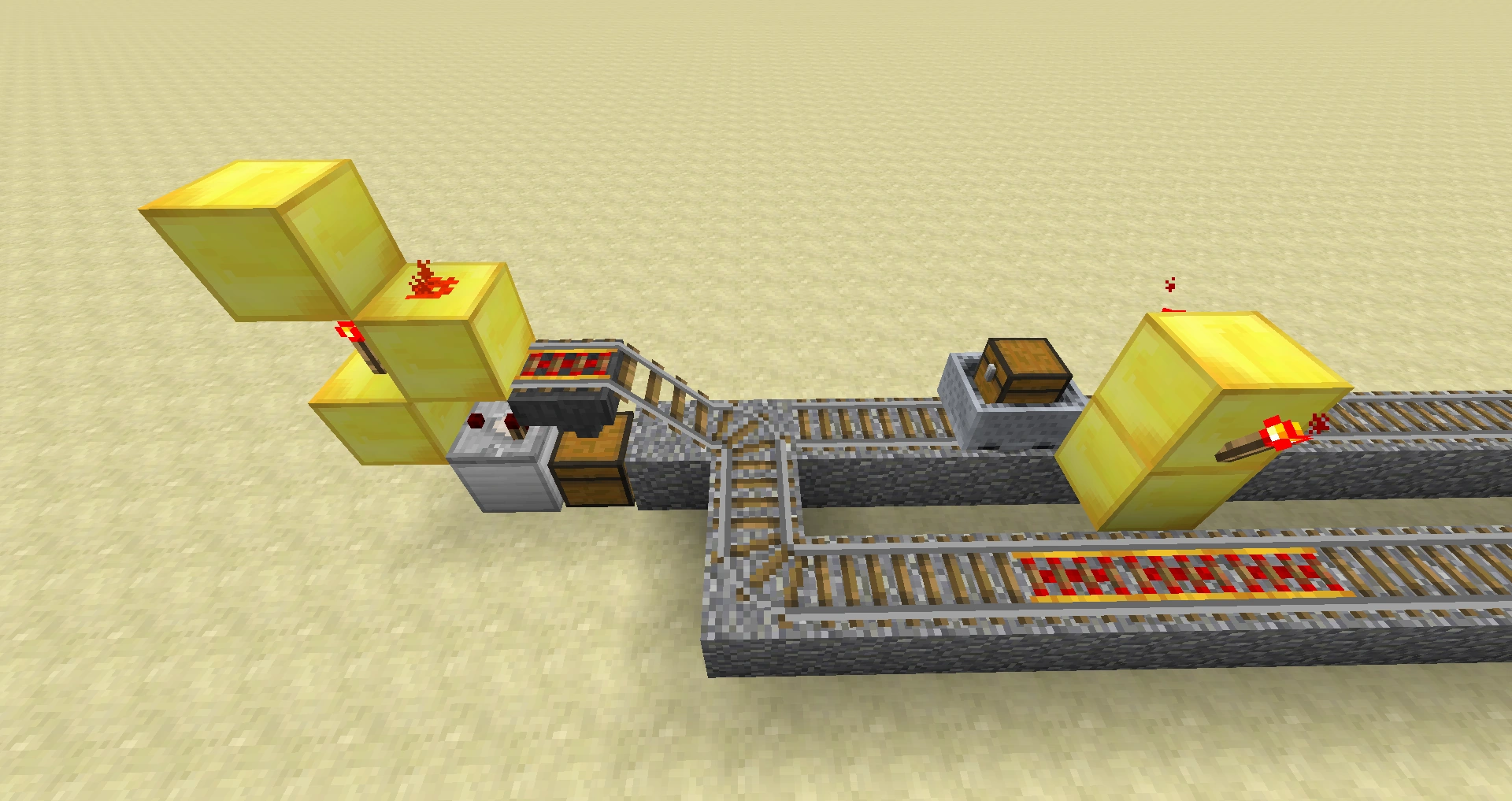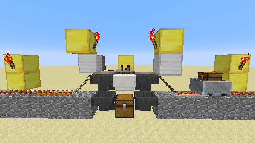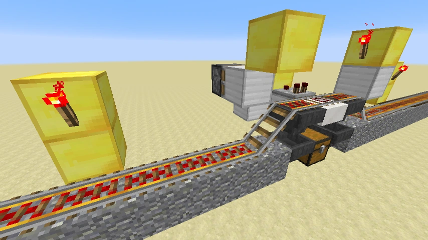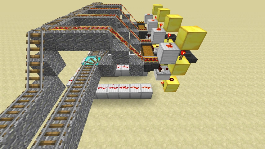 Bei dieser Güter-Entladestation fährt die Güterlore auf eine Antriebsschiene, welche nur dann aktiv ist, wenn der Trichter, den die Güterlore leert, leer ist. So kann eine sehr einfache Güter-Entladestation kreiert werden. Wenn der Trichter eine Lore leert, erkennt der Komparator das und gibt das Signal an den Goldblock weiter, an dem eine Redstone-Fackel hängt. Diese gibt das invertierte Signal an den zweiten Goldblock weiter, welcher das Signal an das Redstone-Kabel abgibt. Dieses setzt die Antriebsschiene in Gang. Güterloren, die vollständig entleert wurden, fahren die Weiche entlang zu einer Rückstrecke, ohne die ankommenden Güterloren zu blockieren.