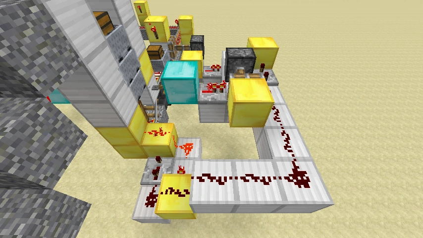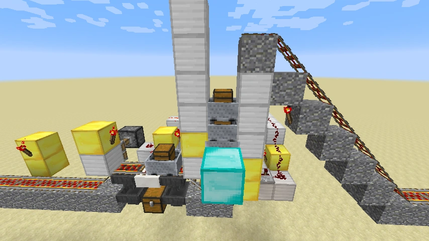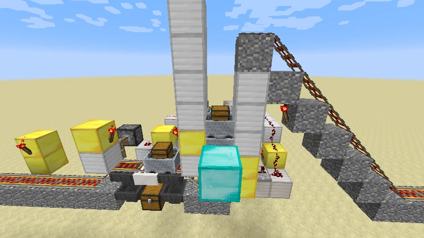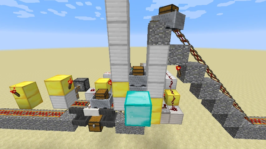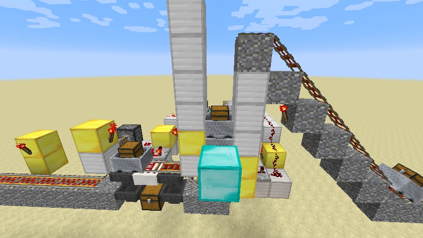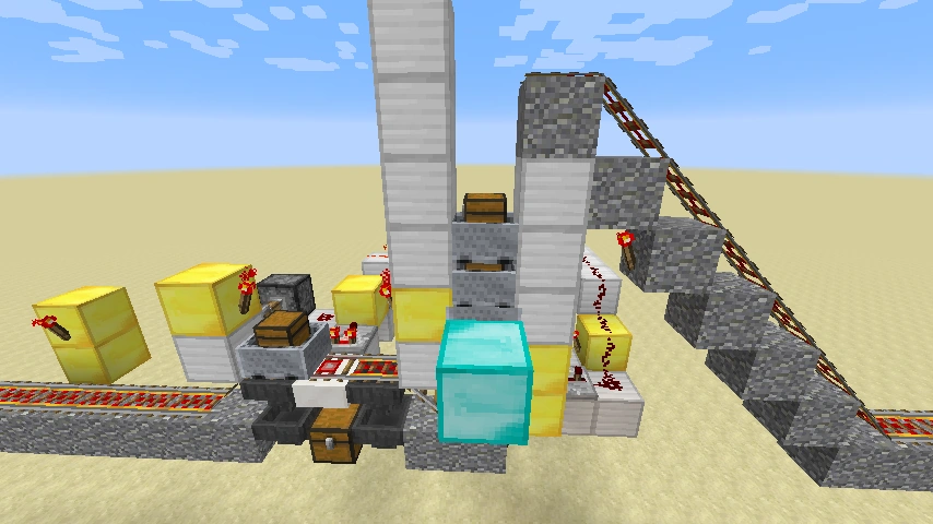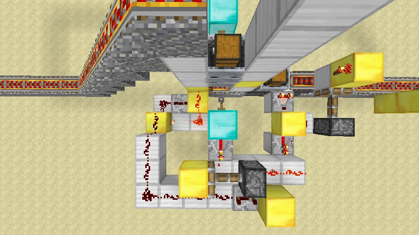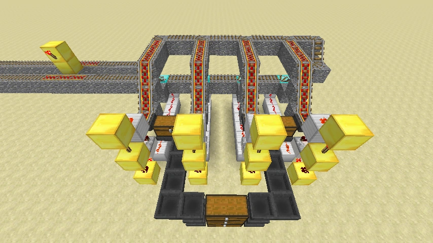 Wenn mehrere Loren gleichzeitig entladen werden sollen, benötigt man oft einen Zwischenspeicher. Hierfür eignet sich dieser Güter-Entlader sehr gut. Er ist mit einem Lorenspeicher gekoppelt, welcher aber nicht nur Loren speichert, sondern auch erkennt, ob Loren gerade entladen werden. Falls dies nicht der Fall ist, lässt er die Lore, die direkt auf der Falltür liegt, durchfallen, alle nachfolgenden jedoch nicht. Es sei denn, die Lore ist entladen und fährt weiter, dann kommt die nächste Lore dran. Der Speicher ist so konstruiert, dass er, wenn keine Lore entladen wird, die erste Lore, die auf die Falltür fällt, durchlässt. Damit das funktioniert, ist ein Stolperdraht direkt über der Falltür platziert (Diamantblock). Dieser erkennt, ob sich eine Lore im Speicher befindet. Wenn das der Fall ist, gibt der Stolperdraht an die Haken ein permanentes Redstone-Signal ab. Dieses Signal geht an einen Kolben-Taktgeber. Dieser gibt in regelmäßigen Zeiten ein Redstone-Signal an den Impulsgeber weiter, welcher die Falltür für einen kurzen Moment öffnet. Damit sich die Falltür nur dann öffnet, wenn keine Güterlore entladen wird, gibt der Komparator, der den Füllstand der gerade zu entleerenden Lore misst auch noch ein Redstone-Signal an den Kolben ab, wenn die Güterlore voll ist. Dieses Signal blockiert den Kolben, wodurch dieser sich nicht zurückziehen kann, wenn der Haken ein Redstone-Signal abgibt.