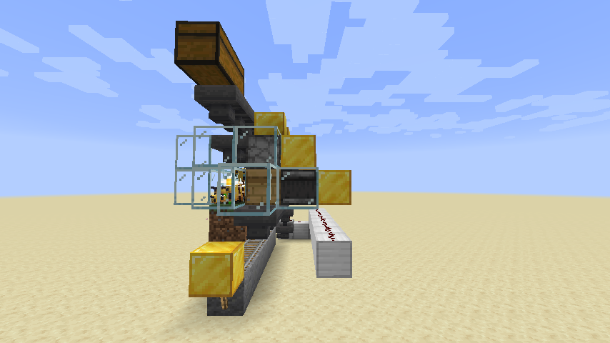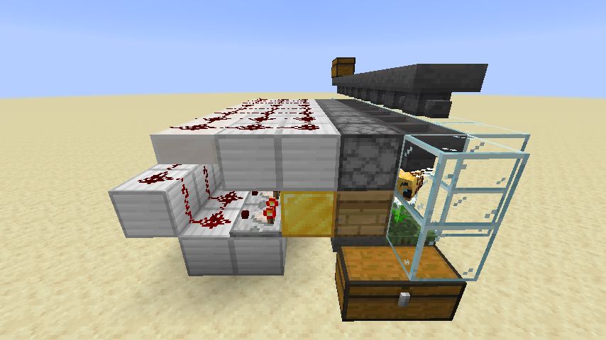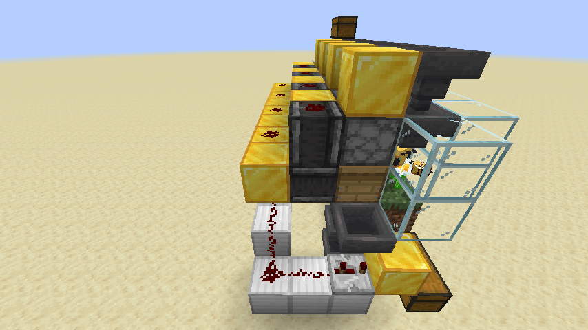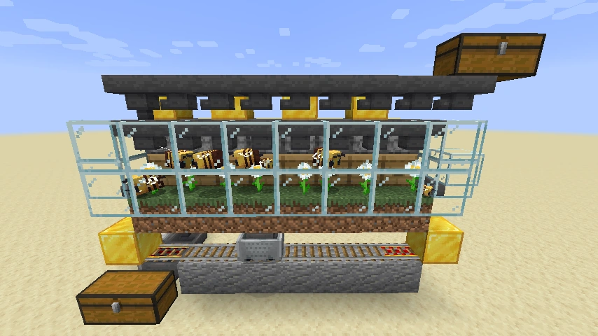Mit dieser Honigfarm lassen sich Honigflaschen ernten. Die Farm besteht aus acht nebeneinander platzierten Bienenstöcken und vor diesen befindet sich auf einem Grasblock eine Blume. Hinter dem Bienennest befindet sich jeweils ein solider Block an dem ein Komparator angeschlossen ist. Der Bienenstock kann bis zu fünfmal von Bienen mit Nektar aufgefüllt werden bis er voll um ihn dann eine Honigflasche zu füllen. Der Komparator kann diese Füllstände des Honigstockes erfassen und erst wenn sein Redstone-Signal die fünfte Stufe erreicht hat, wird der über dem Bienenstock mit Glasflaschen gefüllte befindliche Werfer ausgelöst. Dieser erntet dann den Honig in Honigflaschen, welche von der unter den Bienenstöcken befindlichen Trichterkette aufgesammelt wird. Diese befördert die Honigflaschen in eine seitlich befindliche Truhe. Von dort kann man die Honigflaschen entnehmen. Die Werfer werden mit einer Trichterkette mit weiteren Glasflaschen versorgt und müssen komplett mit leeren Glasflaschen befüllt sein, da ansonsten die gefüllten Flaschen im Werfer landen statt im Trichter unter dem Bienenstock.