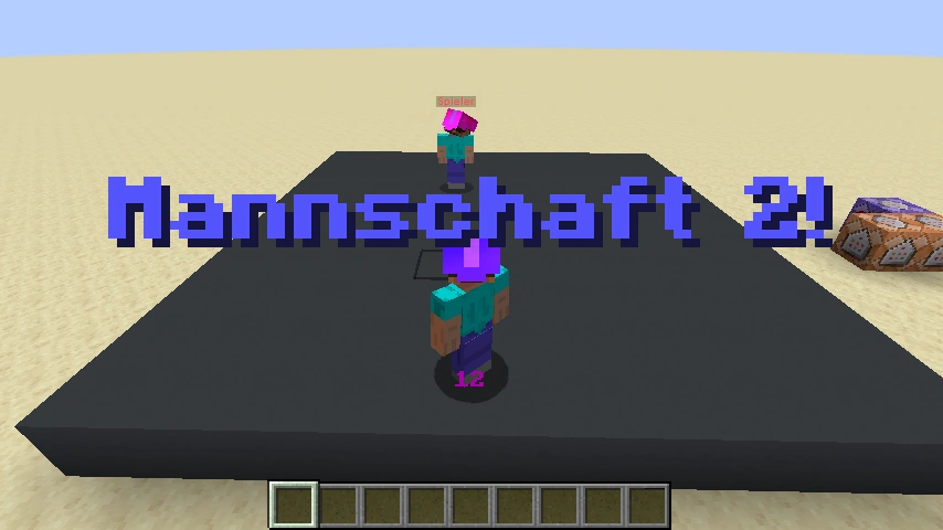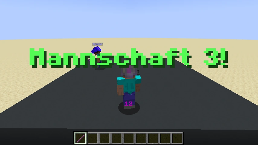 # Der Wert des Zählers wird auf 15 gesetzt. scoreboard players set VarManSV.1Zaehler PZManSV.1Wert 15 # Die Anzahl der Spieler wird in zwei Variablen gespeichert und dann verrechnet. execute store result score VarManSV.1Uebrig PZManSV.1Wert run scoreboard players operation VarManSV.1Aufteilung PZManSV.1Wert = @s PZManSV.1Wert scoreboard players operation VarManSV.1Aufteilung PZManSV.1Wert /= KonstManSV.1ZWEI PZManSV.1Wert scoreboard players operation VarManSV.1Uebrig PZManSV.1Wert %= KonstManSV.1ZWEI PZManSV.1Wert # Alle Spieler auf der Plattform bekommen eine Nummer für eine zufällige Reihenfolge. scoreboard players set VarManSV.1Reihenfolge PZManSV.1Wert 0 execute as @a[tag=EtiManSV.1AufPlattform,sort=random] store result score @s PZManSV.1Wert run scoreboard players add VarManSV.1Reihenfolge PZManSV.1Wert 1 # Grundsätzlich werden alle Spieler in die erste Mannschaft gesteckt um anschließend die Hälfte davon in die zweite Mannschaft zu verschieben. team join TMManSV.1Team1 @a[tag=EtiManSV.1AufPlattform] execute as @a[team=TMManSV.1Team1] if score @s PZManSV.1Wert > VarManSV.1Aufteilung PZManSV.1Wert run team join TMManSV.1Team2 @s # Falls die Anzahl der Spieler ungerade ist, wird die Übrig-Funktion geladen. execute if score VarManSV.1Uebrig PZManSV.1Wert matches 1 run function mannschaftsverteiler:v1uebrig # Spieler in den beiden Teams erhalten im Kopfslot einen farbenen Helm mit der Mannschaftsfarbe. item replace entity @a[team=TMManSV.1Team1] armor.head with minecraft:leather_helmet{EigManSV.1Alle:true,display:{color:16711680},Enchantments:[{id:"binding_curse",lvl:1s}]} item replace entity @a[team=TMManSV.1Team2] armor.head with minecraft:leather_helmet{EigManSV.1Alle:true,display:{color:255},Enchantments:[{id:"binding_curse",lvl:1s}]} # Die Spieler erhalten in ihrer Farbe eine Titelnachricht. title @a[team=TMManSV.1Team1] title ["",{"text":"Mannschaft 1!","color":"red","bold":true}] title @a[team=TMManSV.1Team2] title ["",{"text":"Mannschaft 2!","color":"blue","bold":true}] # Alle Spieler werden auf der Plattform verteilt. spreadplayers ~ ~ 2 4 true @a[tag=EtiManSV.1AufPlattform] |